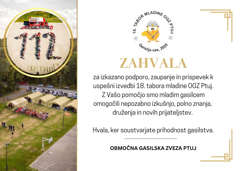 Tukaj bi se radi še enkrat zahvalili vsem, ki ste na kakršenkoli način pomagali in seveda posebna zahvala vsem sponzorjem za izkazano podporo, zaupanje in prispevek k uspešni izvedbi 18. tabora mladine OGZ Ptuj. Z vašo pomočjo smo mladim gasilcem omogočili nepozabno izkušnjo, polno znanja, druženja in novih prijateljstev.